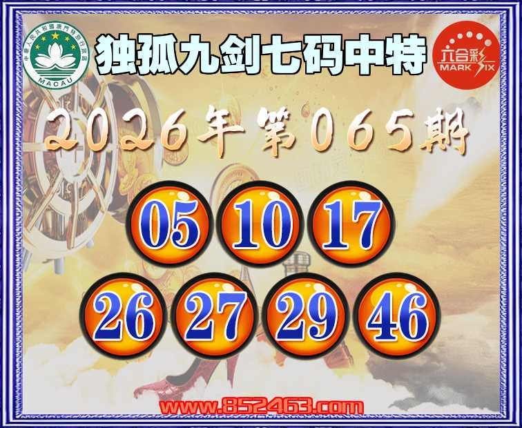 065期:【独孤九剑】 🚵‍♀️七码中特🚵‍♀️【05.10.17.26.27.29.46】开:05