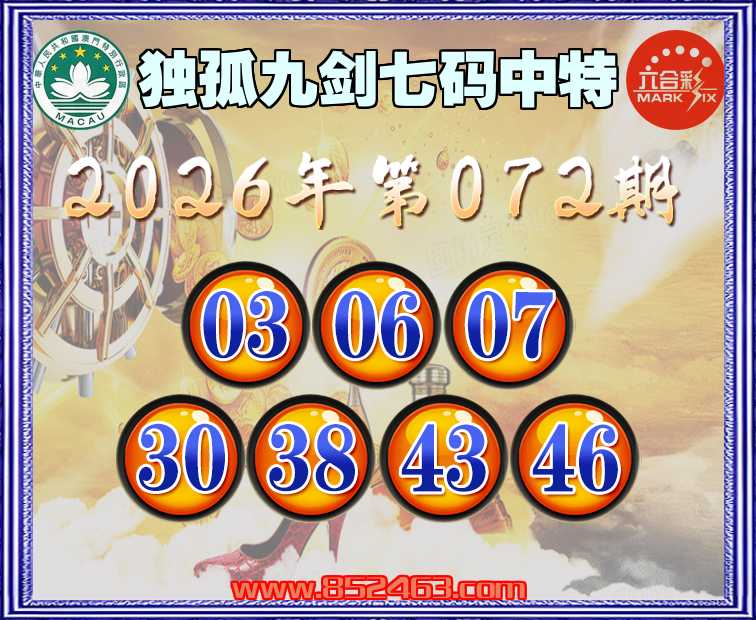 072期:【独孤九剑】 🚵‍♀️七码中特🚵‍♀️【03.06.07.30.38.43.46】开:46