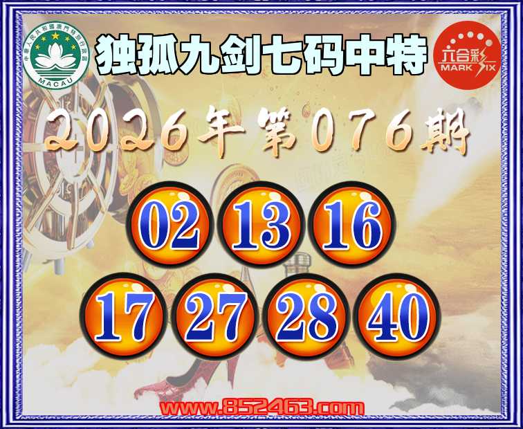 076期:【独孤九剑】 🚵‍♀️七码中特🚵‍♀️【02.13.16.17.27.28.40】开:02