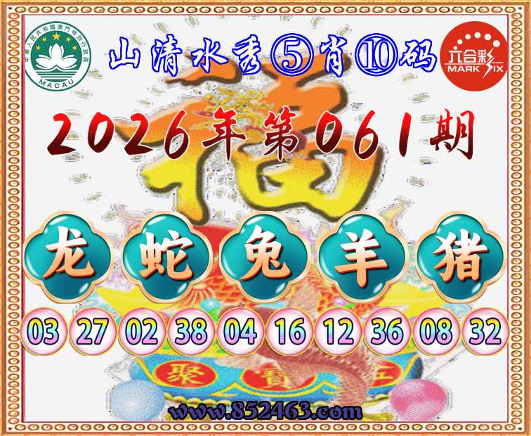 061期:  ♣️『山清水秀』  ♣️⑤肖⑩码 ♣️【龙蛇兔羊猪】开:虎29