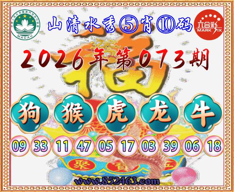073期:  ♣️『山清水秀』  ♣️⑤肖⑩码 ♣️【狗猴虎龙牛】开:鸡34